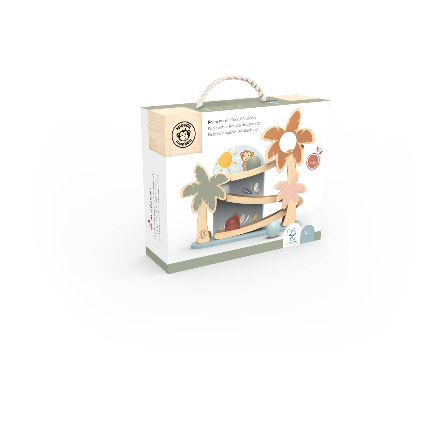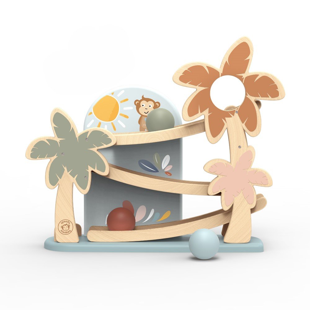 Πρόκειται για μια πρωτότυπη ξύλινη ράμπα σε μια εξωτική διακόσμηση που προσφέρει ώρες διασκέδασης! Τα μικρά παιδιά θα λατρέψουν να βλέπουν τις τρεις ξύλινες μπάλες να κατεβαίνουν στη ράμπα και να εκτοξεύονται στο κάτω μέρος! Πιάστε τις πριν πέσουν, θα πρέπει να είστε γρήγοροι! Μπορεί να βοηθήσει στην ανάπτυξη λεπτών κινητικών δεξιοτήτων, του συντονισμού χεριού-ματιού και της αναγνώρισης χρωμάτων. Αυτό το παιχνίδι είναι κατασκευασμένο από ξύλο βιώσιμης προέλευσης από πιστοποιημένα δάση FSC® και επικαλυμμένο με μη τοξική βαφή.