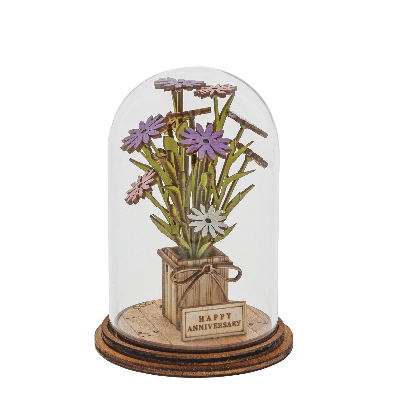 Γιορτάστε μια επέτειο με αυτό το όμορφο λουλουδάτο δώρο. Μια φιλική προς το περιβάλλον διακόσμηση του γυάλινου θόλου που περικλείει ένα μπουκέτο εκπληκτικά μωβ και λευκά λουλούδια, στολισμένα με μια πλακέτα Happy Anniversary. Αυτό το κλασικό vintage, διακοσμητικό Kloche θα κάνει μια εκπληκτική εμφάνιση. Υλικό: Γυαλί με ξύλινη βάση. Συσκευασία: Παρουσιάζεται σε επώνυμη μοναδική βιοδιασπώμενη συσκευασία δώρου.
