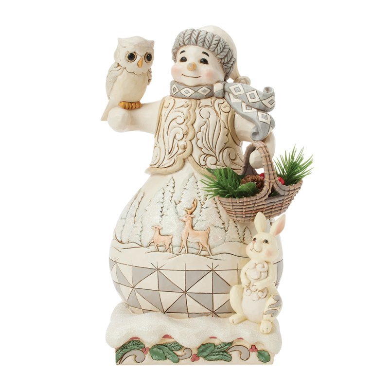 Winter’s Gentle Gatherings (White Woodland Snowman with Basket of Evergreen Sprigs) 26 cm